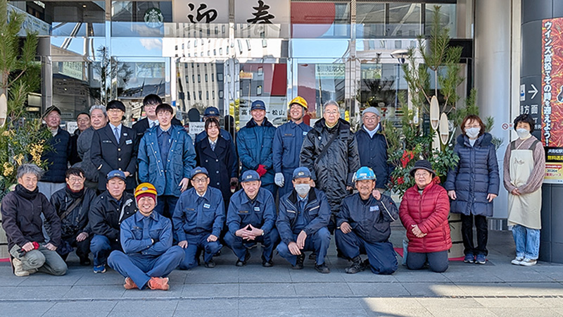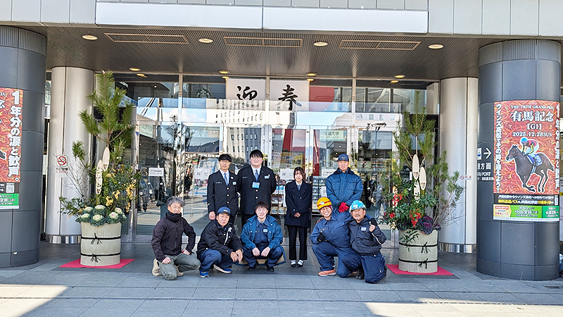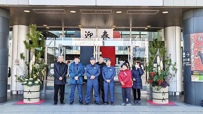 12月26日9時から廣瀬高松駅長以下駅社員7名、高松駅OB、めろんどくらぶたまも多田会長以下会員7名が参加して、造園業の眞井様、小林様、嵯峨流の小山様のご指導の下2時間ほどで雌雄一対の門松を高松駅正面に飾り付けました。